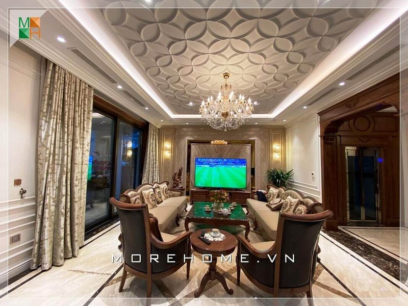 . Sofa phòng khách được thiết kế theo phong cách tân cổ điển sang trọng, được bọc bằng da cao cấp màu kem, tạo nên không gian tinh tế và sang trọng.
